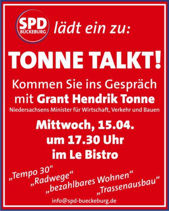 Du hast Fragen, Ideen oder einfach Lust auf einen offenen Austausch? Dann sei dabei, wenn Grant Hendrik Tonne am 15. April ab 17:30 Uhr im Bistro in Bückeburg zu Gast ist!